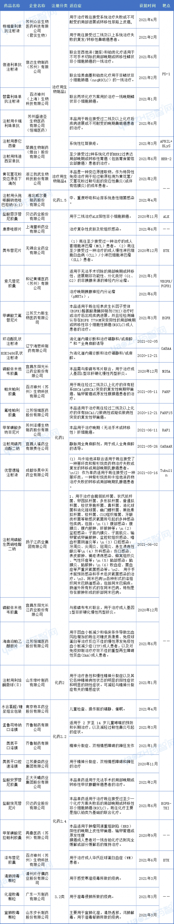 从药品类型而言,其中包括7个治疗用生物制品,17个化药1类创新药,9个改良型新药。包括PD-1单抗、PARP抑制剂、EGFR-TKI、ADC等多个市场热点。其中,值得提及的是截至2020年底,国产4大PD-1均通过医保谈判全部纳入目录内,且各家总体降幅在70%左右,以换取量的保障。