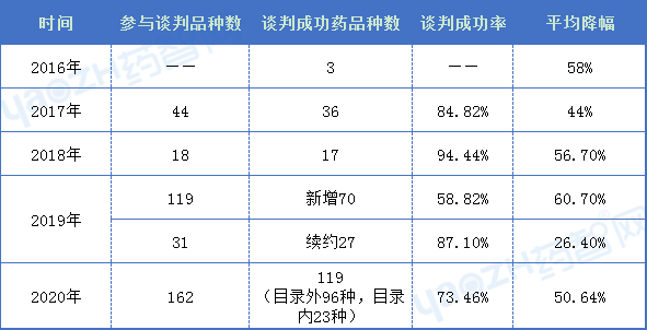 2016年至今每一年国家都对药价进行谈判,目前已进行了5轮医保谈判。第一轮医保谈判于2016年由原国家卫计委主导,2018年在国家医保局成立以前,医保目录调整归人社部管理;2018年以来,国家医保局连续三年调整医保药品目录,共纳入433种新药、好药,233个谈判准入药品价格平均降幅超高50%。
