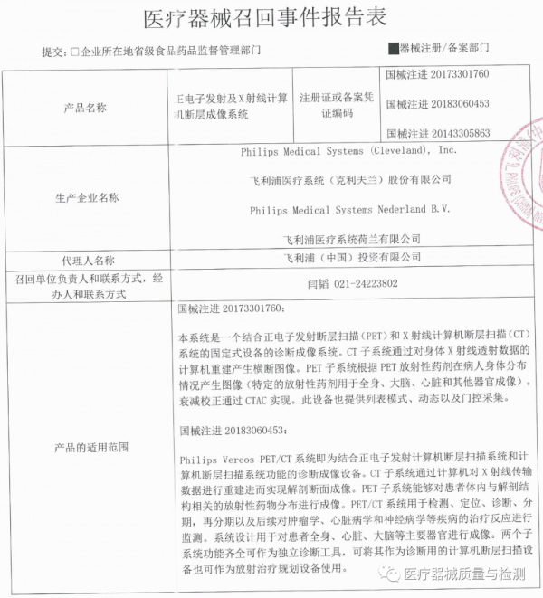 飞利浦(中国)投资有限公司报告,由于涉及特定型号、特定批次产品,存在若监视器支架组装件轴的严重磨损未能识别,可能会导致监视器支架组装件从悬架臂上脱落的问题,生产商Philips Medical Systems(Cleveland), Inc飞利浦医疗系统(克利夫兰)股份有限公司对正电子发射及X射线计算机断层成像系统PET/CT Imaging System(注册证号:国械注进20143305863、国械注进20173301760、国械注进20183060453)主动召回。召回级别为三级。