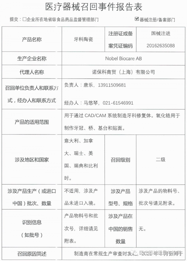 Nobel Biocare AB二级召回牙科陶瓷 诺保科商贸(上海)有限公司报告,由于涉及特定型号、特定批次产品,存在2021年3月份用于生产的一台烧结炉未达到合适的烧结曲线问题,生产商Nobel Biocare AB对牙科陶瓷 Nobel Procera Dental Ceramics(注册证号:国械注进20162635088)主动召回。召回级别为二级。