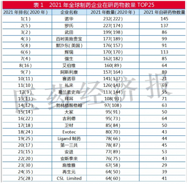 武田排名略有下滑,从2020年的第2位降至第3位,但在研药物数量未见明显变化。