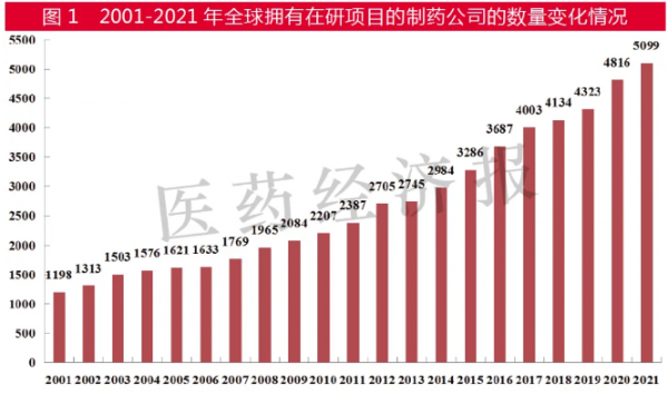 另一方面,全球拥有在研药物项目的制药公司数量继续增加,从2001年的1198家增至2021年的5099家。从增幅看,2021年全球制药公司数量增幅为5.9%,较2020年11.4%的增幅减少。