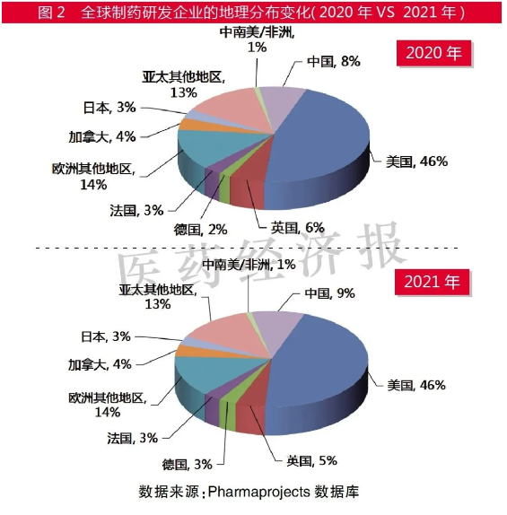 作为全球新药研发的主要动力来源,美国和欧洲占比基本维持不变,而亚洲地区的占比从2020年的24%增至2021年的25%。