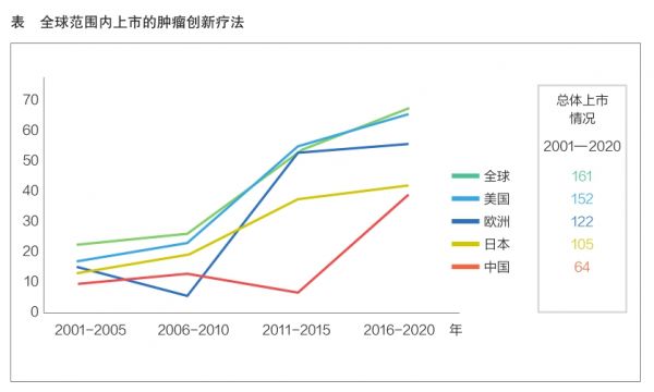全球范围内肿瘤创新疗法的上市情况各不相同:2016年-2020年中国批准了37种新的抗癌药物,高于2011年-2015年的6种;2016年-2020年,欧洲和美国分别批准了53种和62种肿瘤创新药(见图)。