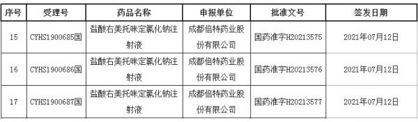 7月14日,国家药监局官网显示,成都倍特药业以仿制3类报产的盐酸右美托咪定氯化钠注射液获批,是该产品第2家获批的企业。今年1月,江苏恒瑞医药的盐酸右美托咪定氯化钠注射液获批,拿下首仿。米内网数据显示,2020年中国公立医疗机构终端右美托咪定注射剂销售额接近40亿元。
