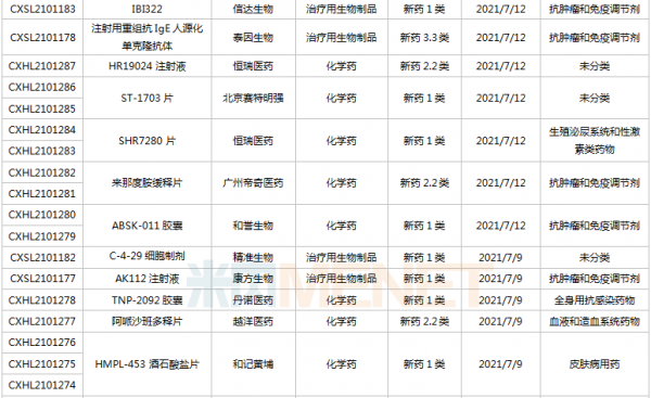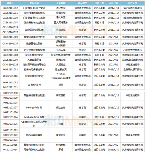 6月26日-7月16日期间,21个新药(28个受理号)上市申请获得CDE承办。12款为国产新药,其中4款为1类新药,包括正大天晴康方的派安普利单抗注射液、银珠医药/长城制药的羧胺三唑软胶囊、光谷人福的广金钱草总黄酮胶囊及乐普生物/鼎康生物的普特利单抗注射液;10款为进口新药,赛生医药的那昔妥单抗注射液、梯瓦医药的醋酸格拉替雷注射液、信达的Pemigatinib片、武田的Mobocertinib胶囊、康哲药业的地西泮鼻喷雾剂、协和麒麟的莫格利珠单抗注射液为首次报产。