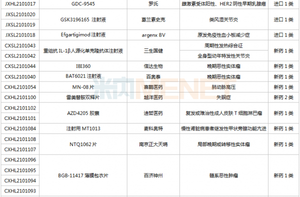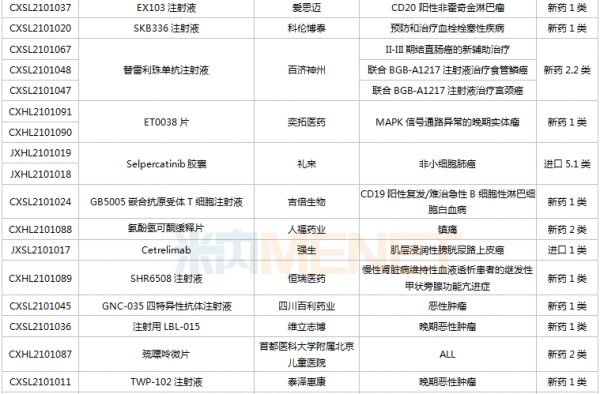 多款新药新适应症报产,包括百济神州的PD-1替雷利珠单抗(局部晚期或转移性食管鳞状细胞癌)、荣昌生物的ADC药物维迪西妥单抗(局部晚期或转移性尿路上皮癌)、贝达的恩沙替尼(ALK阳性非小细胞肺癌)等。