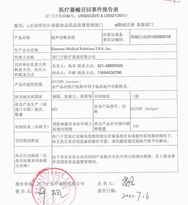 3、西门子医疗系统有限公司报告,由于涉及特定型号、特定批次产品,可能存在已安装电池组的部分涉事系统在未连接外部电源的情况下,有无法正常启动设备的潜在问题,生产商美国西门子医疗系统股份有限公司Siemens Medical Solutions USA, Inc.对超声诊断系统Diagnostic Ultrasound System(注册证号:国械注进20192060016)主动召回。召回级别为二级。