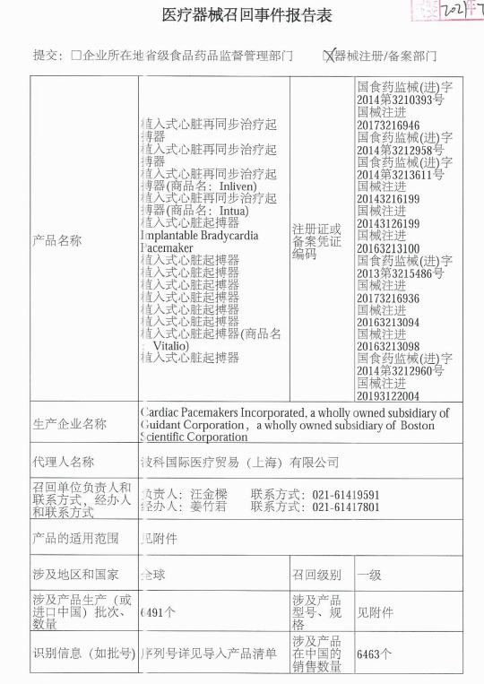 值得注意的是,此次波科国际医疗贸易(上海)有限公司的植入式心脏再同步治疗起搏器产品涉及11个批号,包括国食药监械(进)字2014第3210393号;国械注进20173216946;国食药监械(进)字2014第3212958号;国食药监械(进)字2014第3213611号;国械注进20143216199;国械注进20143126199;国械注进20163213100;国食药监械(进)字2013第3215486号;国械注进20173216936;国械注进20163213094;国械注进20163213098;国食药监械(进)字2014第3212960号,国械注进20193122004等。召回等级也从二级变更为一级,上述涉及的产品在中国的销售数量为6463个。