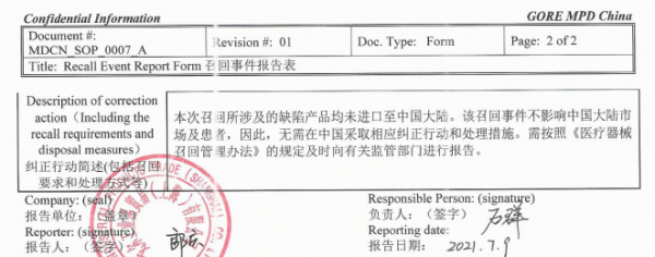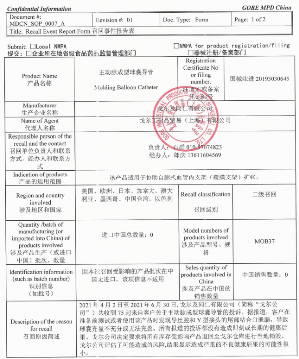 2、戈尔工业品贸易(上海)有限公司报告,由于涉及特定型号、特定批次产品,可能存在准备前测试或者使用该产品时发现导丝腔和Y型接头的尾部粘合口泄漏,导致球囊充盈不充分或无法充盈的问题,生产商戈尔及同仁有限公司对主动脉成型球囊导管Molding Balloon Catheter(注册证号:国械注进20193030645)主动召回。召回级别为二级。