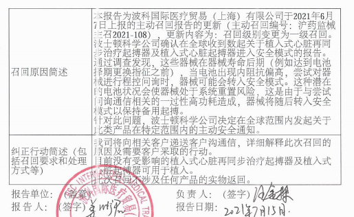 1、波科国际医疗贸易(上海)有限公司报告,由于涉及特定型号、特定批次产品,存在器械寿命后期(例如达到电池择期更换指征之前),当电池出现内阻抗偏高,尝试对器械进行程控问询时,器械可能会转入安全模式,这种潜在的电池状况会使器械处于系统重置风险的问题。波科国际医疗贸易(上海)有限公司对植入式心脏再同步治疗起搏器等产品(注册证号:国食药监械(进)字2014第3210393号;国械注进20173216946;国食药监械(进)字2014第3212958号;国食药监械(进)字2014第3213611号;国械注进20143216199;国械注进20143126199;国械注进20163213100;国食药监械(进)字2013第3215486号;国械注进20173216936;国械注进20163213094;国械注进20163213098;国食药监械(进)字2014第3212960号;国械注进20193122004)主动召回。相关产品召回信息已于2021年6月7日发布,召回级别为二级,现将召回级别变更为一级。