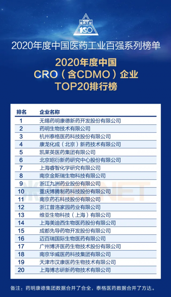 在2020年度中国CRO(含CDMO)企业TOP20排行榜中,药明康德、药明生物、泰格医药位列前三甲;
