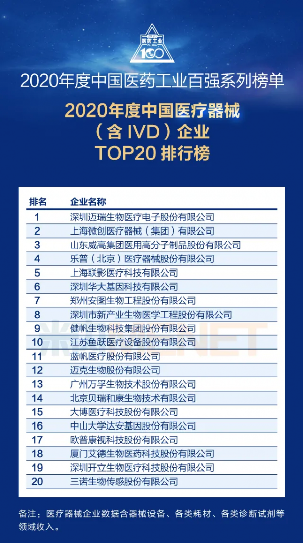 在2020年度中国医疗器械(含IVD)企业TOP20排行榜中,迈瑞医疗、微创医疗、威高股份位列前三甲;