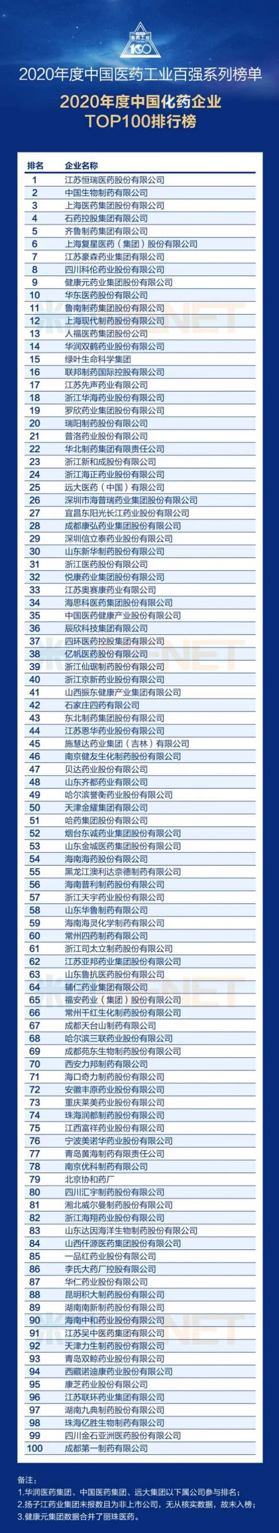 在2020年度中国化药企业TOP100排行榜中,恒瑞医药、中国生物制药、上海医药集团位列前三甲;