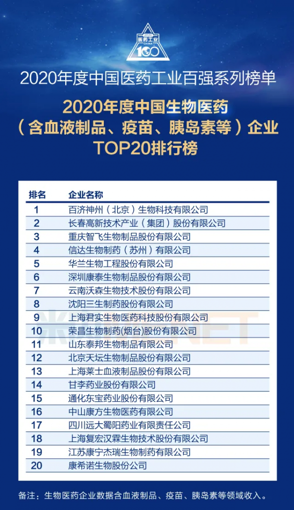 在2020年度中国生物医药(含血液制品、疫苗、胰岛素等)企业TOP20排行榜中,百济神州、长春高新、智飞生物位列前三甲。