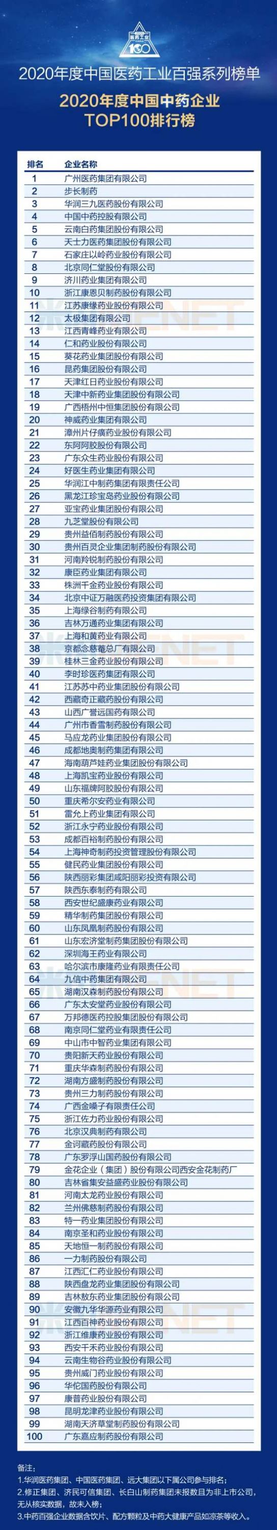 在2020年度中国中药企业TOP100排行榜中,广药集团、步长制药、华润三九位列前三甲;