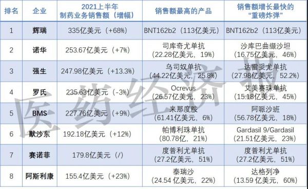 近段时间,各大跨国药企陆续发布半年报,已有八大跨国药企巨头公布了最新的业绩。受新冠肺炎业务调整、重磅药物增长面临不同境地影响,今年上半年,各大跨国药企排名迎来新一轮洗牌,辉瑞凭借新冠肺炎疫苗翻身,自剥离普强业务后重夺冠军宝座。诺华、强生受重磅产品快速增长拉动,业绩迅速攀升。罗氏由于持续受生物类似药冲击,是目前已公布半年报中唯一一家业绩出现负增长的药企巨头。