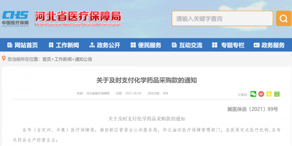 8月3日,河北省医保局发布《关于及时支付化学药品采购款的通知》(以下简称《通知》)指出,医疗机构要及时结算化学药品药款,回款时间不得超过2个月,对回款超过3个月的可暂缓拨付当期医药费用。同时要求,医保局主要领导要亲自抓,将符合规定的医药费及时拨付给医疗机构,不拖延、不欠款。