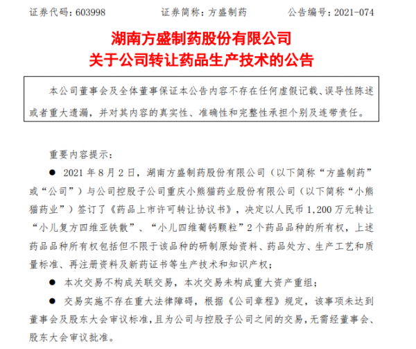 2021年8月2日,方盛制药与控股子公司小熊猫药业签订了《药品上市许可转让协议书》,决定以人民币1200万元转让“小儿复方四维亚铁散”、“小儿四维葡钙颗粒”2个药品品种的所有权。上述药品品种所有权包括但不限于该品种的研制原始资料、药品处方、生产工艺和质量标准、再注册资料及新药证书等生产技术和知识产权。