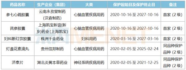 2020年,NMPA仅发布了两次中药保护品种公告,共有5个产品获得批准保护,其中参七心疏胶囊、芪参胶囊、妇科断红饮胶囊为首家中药2级保护品种,保护期限自公告日起七年,灯盏花素滴丸和济泰片为同品种保护品种,保护终止日与同品种首家的终止日一致。