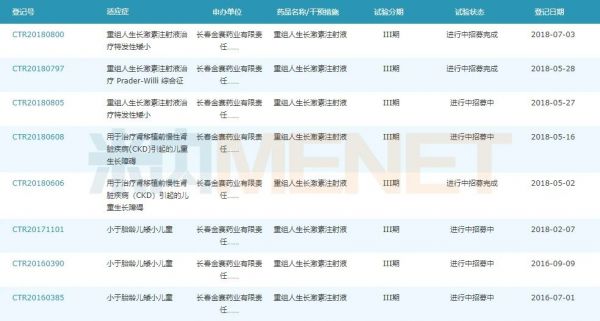 长春金赛药业在2005年拿下批文,目前已获批的适应症包括用于因内源性生长激素缺乏所引起的儿童生长缓慢、重度烧伤治疗、已明确的下丘脑一垂体疾病所致的生长激素缺乏症和经两种不同的生长激素刺激试验确诊的生长激素显著缺乏。