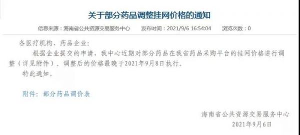 9月6日,海南省公共资源交易服务中心发布了《关于部分药品调整挂网价格的通知》,对689个药品在该省药品采购平台的挂网价格进行调整。