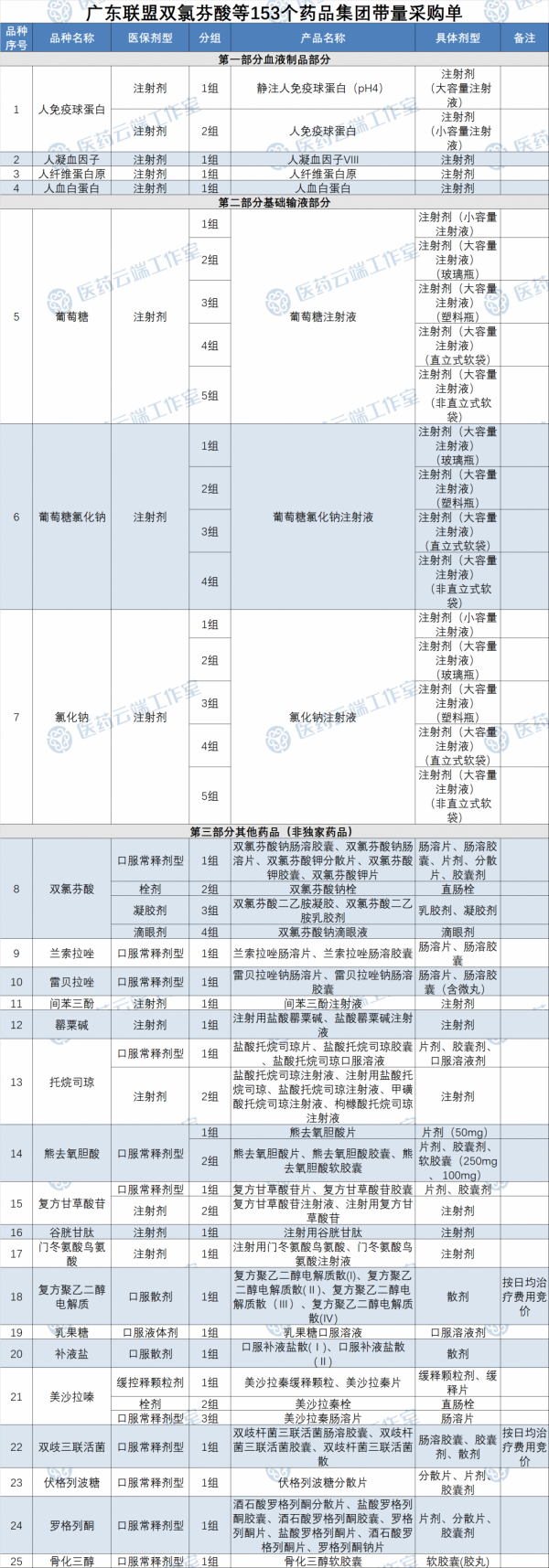此前(9月30日),广东省药交中心发布《广东联盟双氯芬酸等153个药品集团带量采购文件(征求意见稿)》,涉及153个品种,包括血液制品3个、基础输液4个和其他药品146个,其中50个为独家品种(分组后,现为51个)详见文末附表。