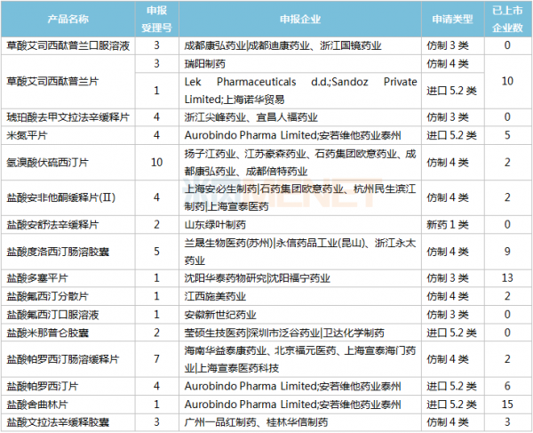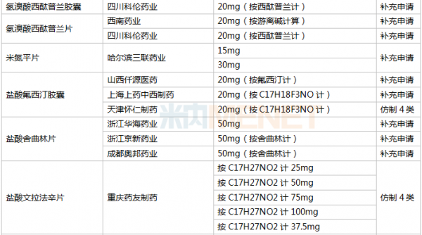 此外,草酸艾司西酞普兰口服溶液、琥珀酸去甲文拉法辛缓释片、盐酸氟西汀口服溶液等产品均无企业获批,涉及成都康弘药业|成都迪康药业、浙江国镜药业、浙江尖峰药业、宜昌人福药业等多家企业。