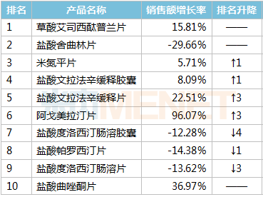产品TOP10销售额均超过1亿元,草酸艾司西酞普兰片仍然稳居首位。从增速来看,阿戈美拉汀片最快,超过90%,盐酸文拉法辛缓释片和盐酸曲唑酮片均超过20%。