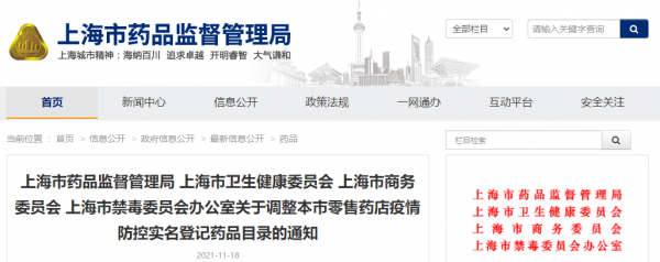 11月18日,上海市药监局、卫健委等多个部门联合发布了《关于调整本市零售药店疫情防控实名登记药品目录的通知》(以下简称《通知》)。