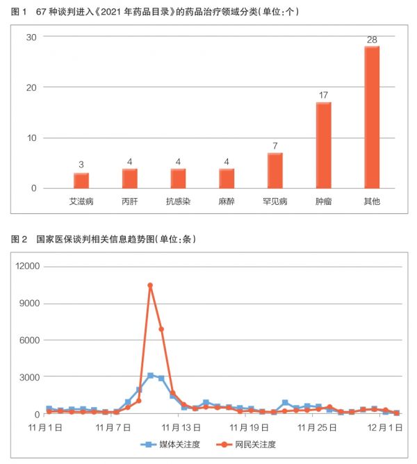 从谈判情况看,67种谈判进入目录的药品平均降价61.71%。在这67种药品中,有17种抗肿瘤药物和7种罕见病用药(见图1)。值得注意的是,此前备受关注的“70万元一针的天价药”脊髓性肌肉萎缩症治疗药物诺西那生钠注射液,以及年治疗费用过百万元的法布雷病治疗用药阿加糖酶α注射用浓溶液都成功进入《2021年药品目录》,开创高值罕见病用药纳入医保的先河。