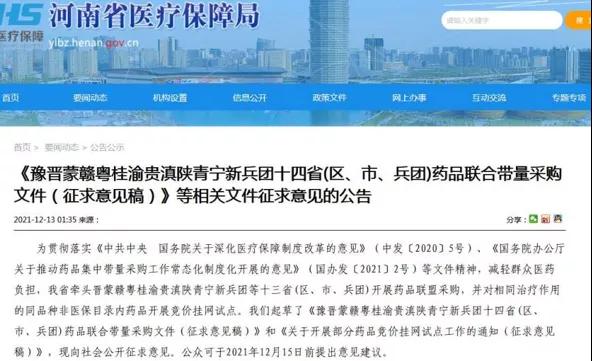 12月13日,河南省医保局官网对外正式公布了《豫晋蒙赣粤桂渝贵滇陕青宁新兵团十四省(市、区、兵团)药品联合带量采购文件(征求意见稿)》(以下简称《意见稿》)。这个覆盖了近半个中国的区域联盟带量采购单位在《意见稿》中明确,符合申报要求但未参与集采的企业,将影响其所涉药品在联盟区域内的挂网采购。关乎14个省市区,没有企业能忽视这一联盟市场的任何风吹草动。