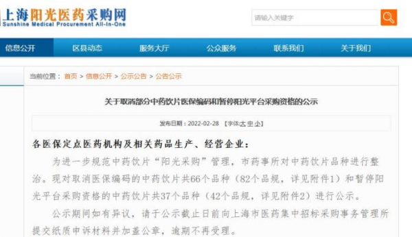 2月28日,上海医药阳光采购网发布一则新公示,为了进一步规范中药饮片的“阳光采购”管理,该市药事所出手对中药饮片品种进行大整治。根据附件清单,拟取消蛇胆、菊花跟、罗汉果、沉香等66个品种(82个品规)的医保编码,同时暂停熊胆粉、枸杞叶、灯心草炭、林下山参、冬虫夏草、牛黄等37个品种(42个品规)的阳光采购资格。