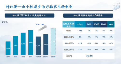 作为医院采购国内前五大品种的超大品种中,特比澳获得了更优秀的超预期表现。去年销售额达到三十多亿的特比澳,本次谈判不降价,可见竞争力强的垄断性产品依旧具备很强的定价权, 特比澳作为全球唯一上市的rTPO产品,超强定价权背景下作为现金奶牛大品种不断刷新峰值,其未来数年峰值及估值能去到哪里?