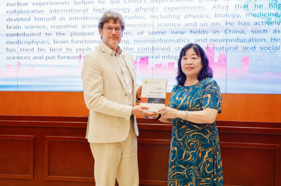 浙江大学外国语言文化与国际交流学院教授王小潞向Steven Laureys教授赠送唐孝威院士的著作