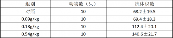 2003年,海南海药股份有限公司委托上海市预防医学研究院,通过动物试验,对红宝太和胶囊增强免疫力的功能进行检验。实验结果表明:红宝牌太和胶囊对动物具有增强免疫力功能。以血清溶血素试验为例,在动物连续给样30 天后,血清溶血素抗体积数试验数据如下: