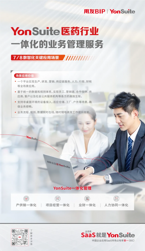 在医药行业这个充满挑战和机遇的领域里,YonSuite无疑为企业带来了一股清新的数智化之风。YonSuite在医药行业八大场景的深入应用,不仅能够帮助企业提升工作效率、优化业务流程,还能确保产品质量和满足监管要求。未来,YonSuite将继续为医药行业企业创造更多价值,成就数智企业!