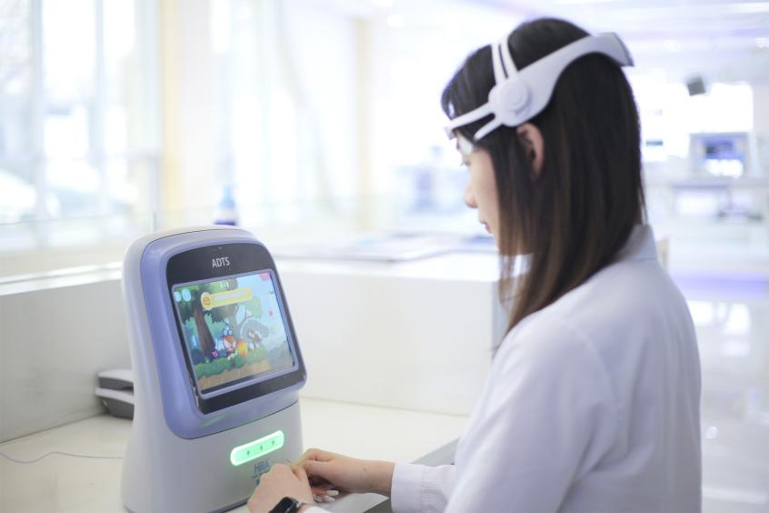 ADTS记忆力障碍训练仪是在动态脑电及行为控制基础上开发的可视化高龄亲和及记 忆力退化训练设备。该系统以注意力、记忆力、计算力、定向力、语言力和综合能力等多维度指标提升为训练目标,通过专业智能康复游戏形式进行训练,可有效提高脑电复 杂度及近似熵,激活大脑皮层神经细胞,阻止记忆力及脑功能的进一步退化及病变,以达到预防和治疗认知的目的。