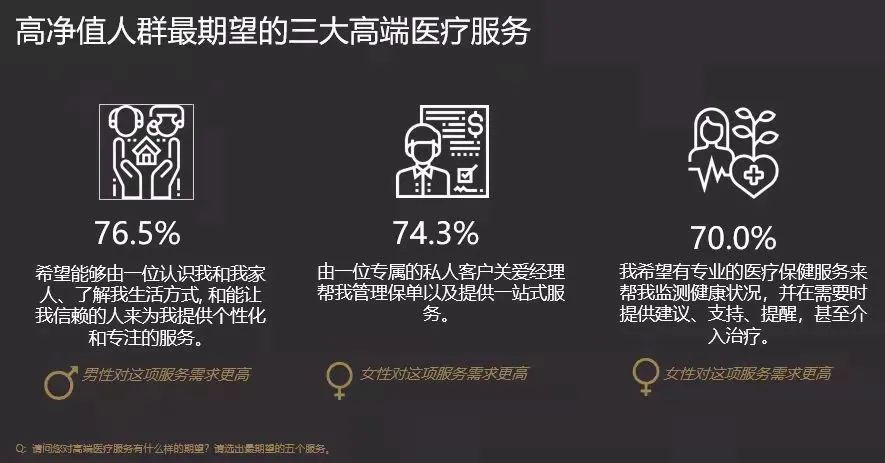 围绕高净值人群需求变化,国内各大银行、财富管理机构以及保险企业都在积极探索健康生态圈建设,开拓医疗健康服务,作为产品业务拓展的工具和留存 VIP 客户增值服务的手段。