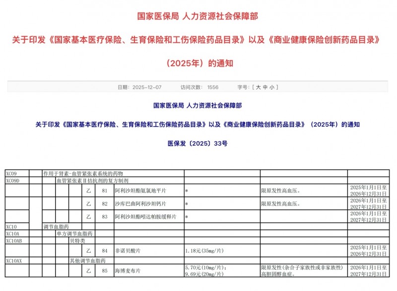 2025年12月7日,国家医保局、人力资源社会保障部公布《国家基本医疗保险、工伤保险和生育保险药品目录(2025年)》,信立泰自主研发的信超妥®(沙库巴曲阿利沙坦钙片)成功入选医保。这款药物是最新获得《中国高血压防治指南(2024年版)》推荐的国产原研新一类降压药,全球第二款原研ARNI类降压药。