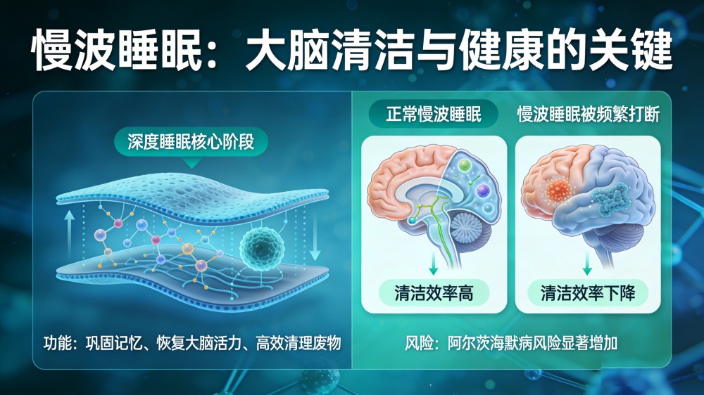 进一步的研究更精准地指出,慢波睡眠的减少,是阿尔茨海默病风险升高的重要信号。慢波睡眠作为深度睡眠的核心阶段,不仅能帮助我们巩固记忆、恢复大脑活力,更是大脑高效清理废物的关键时期。当慢波睡眠被频繁打断,大脑的“清洁效率”会大幅下降,有害物质持续堆积,就会让患阿尔茨海默病的风险显著增加。