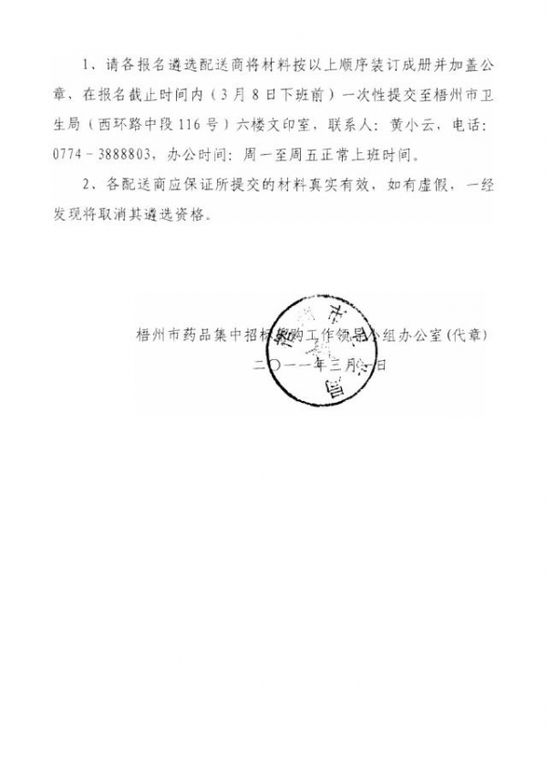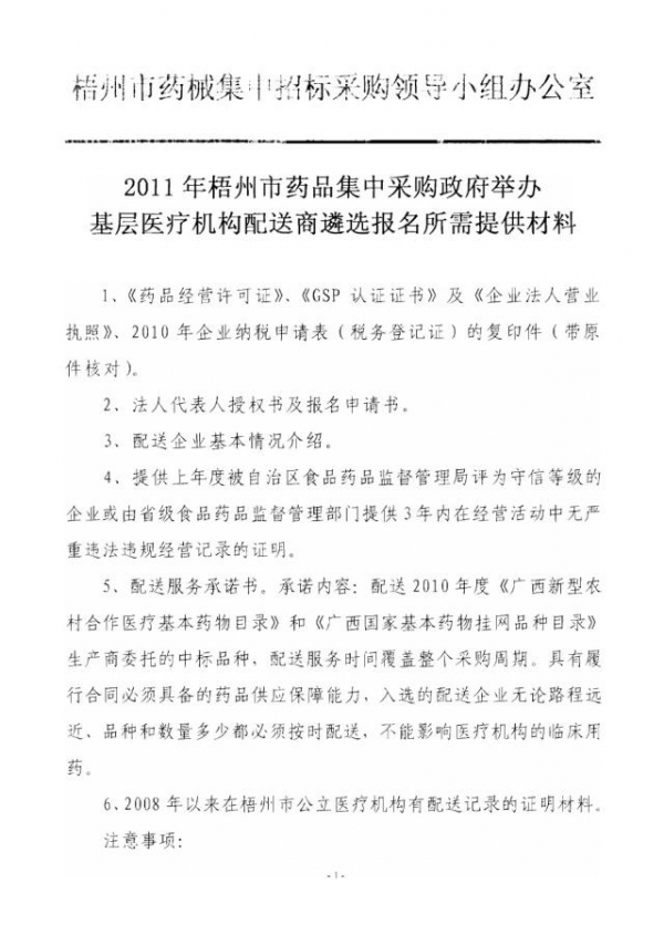 2011年广西梧州市药品集中采购政府举办基层医疗机构配送商遴选报名所需提供材料