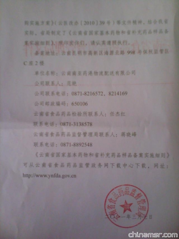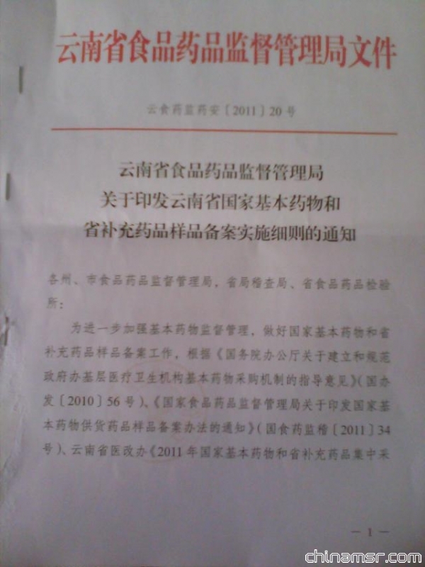 2011年云南关于印发国家基本药物和省补充药品样品备案实施细则通知