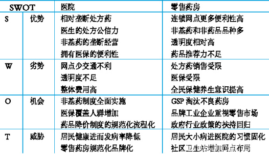 做市场的都知道SWOT分析,这是认识产品差异化的起点,如果我们将医院和零售药店作为两种互为竞争的产品来看待,尝试用SWOT分析,也许能看出一些端倪(如下图表所示)。