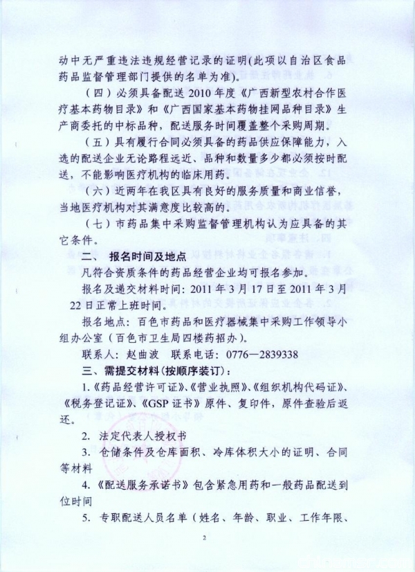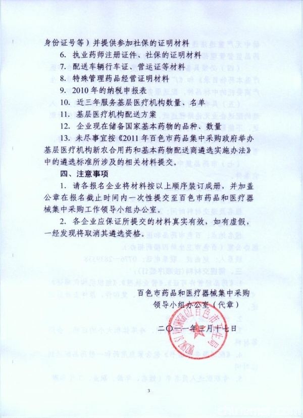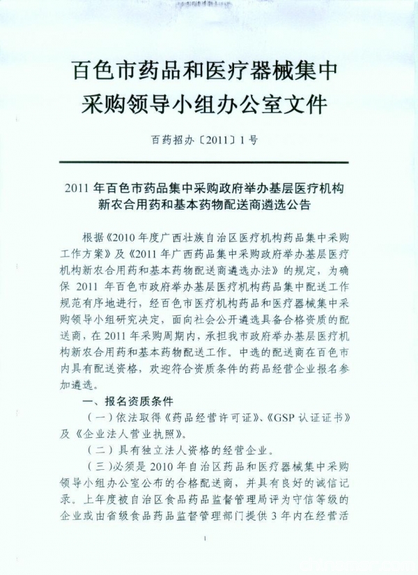 2011年广西百色市药品集中采购政府举办基层医疗机构新农合用药和基本药物配送商遴选公告