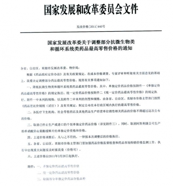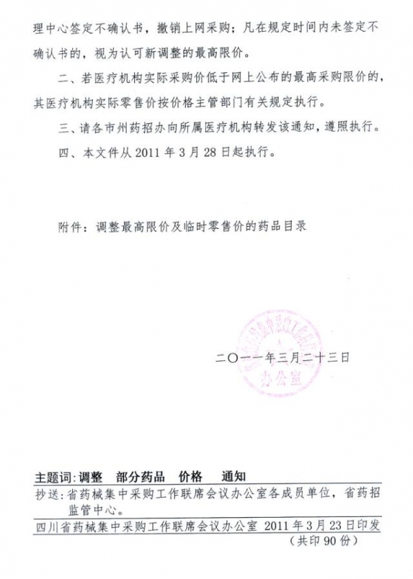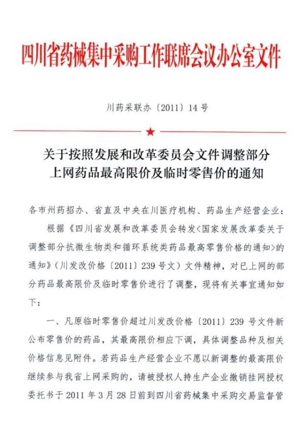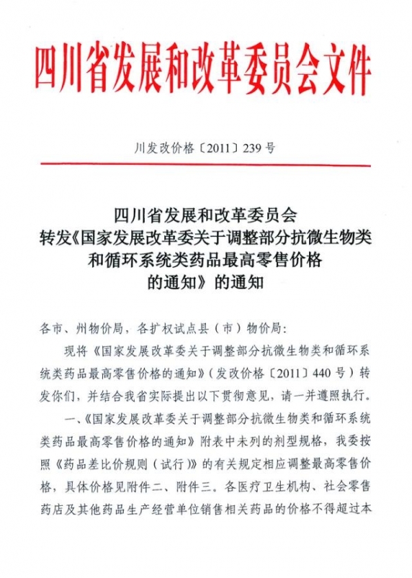 2011年四川省关于按照发展和改革委员会文件调整部分上网药品最高限价及临时零售价的通知