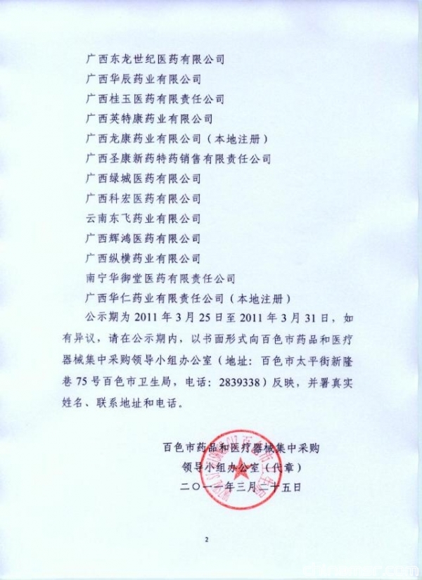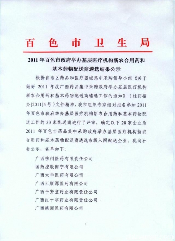 2011年广西百色市药品集中采购政府举办基层医疗机构新农合用药和基本药物配送商遴选结果公示