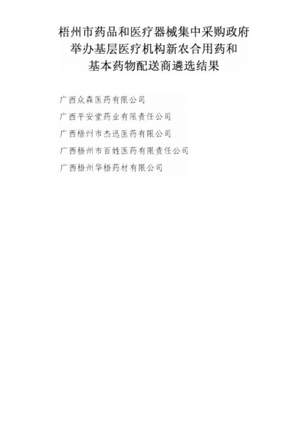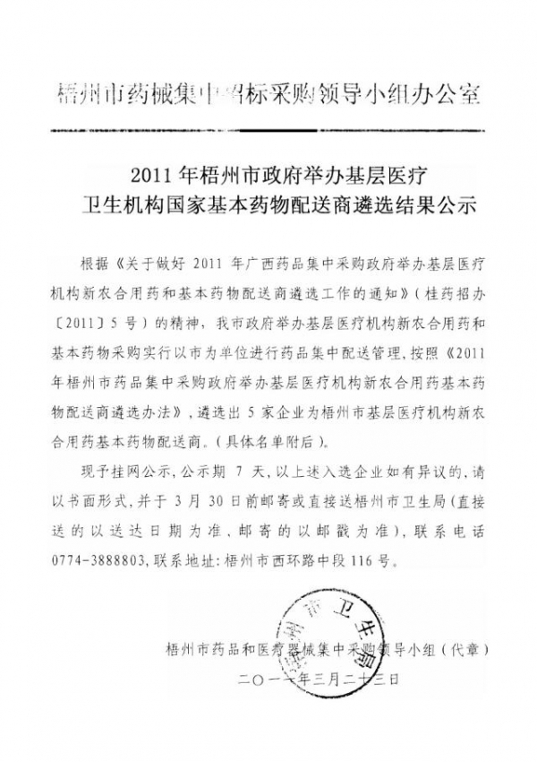2011年广西梧州市政府举办基层医疗卫生机构国家基本药物配送商遴选结果公示