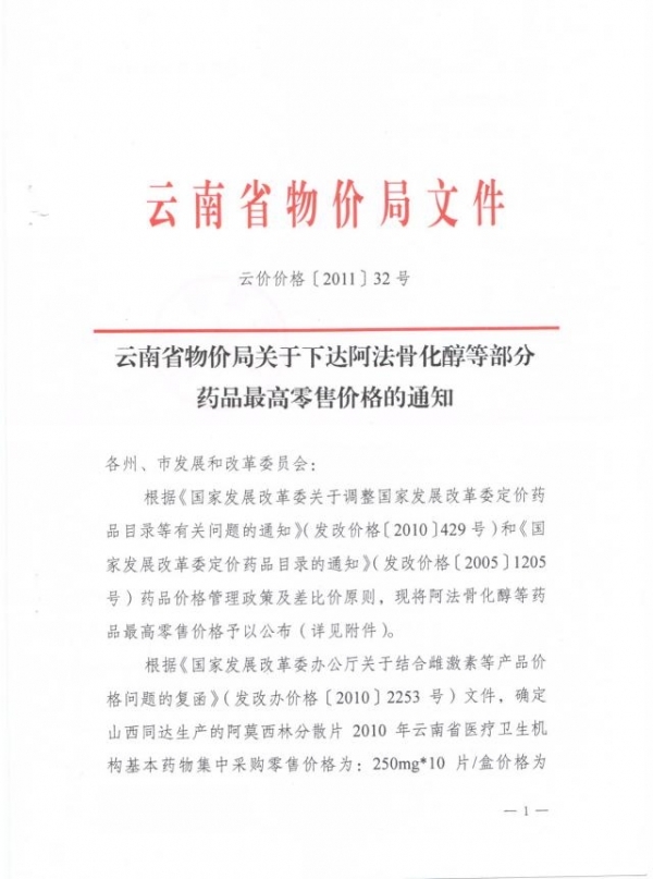 2011年云南省物价局关于下达阿法骨醇等部分药品最高零售价格通知