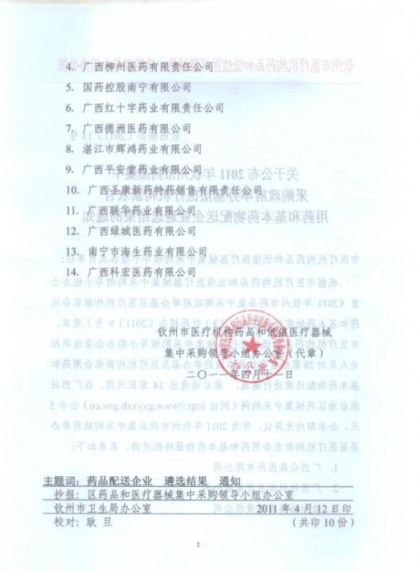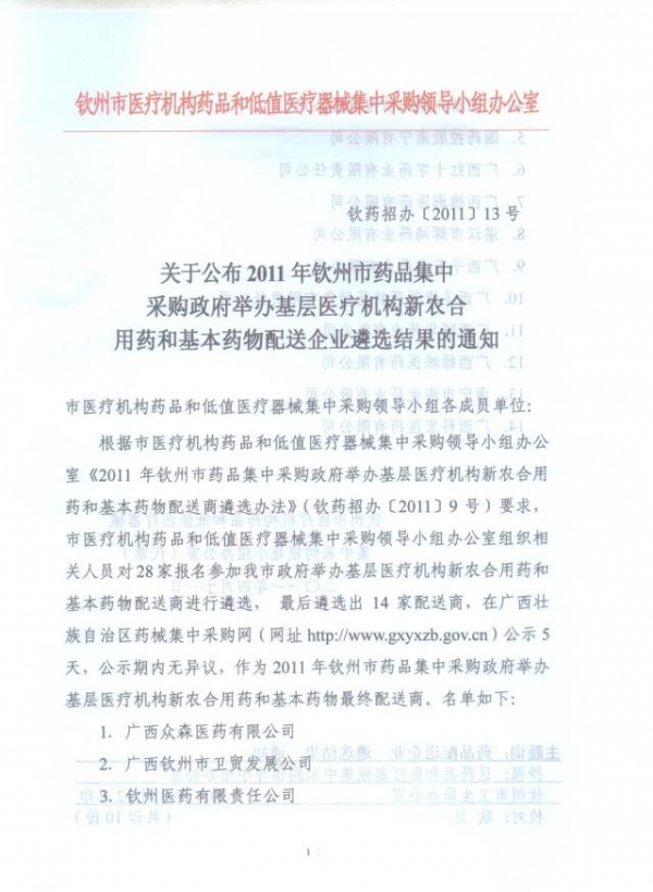 2011年广西钦州市关于公布药品集中采购政府举办基层医疗机构新农合用药和基本药物配送企业遴选结果的通知